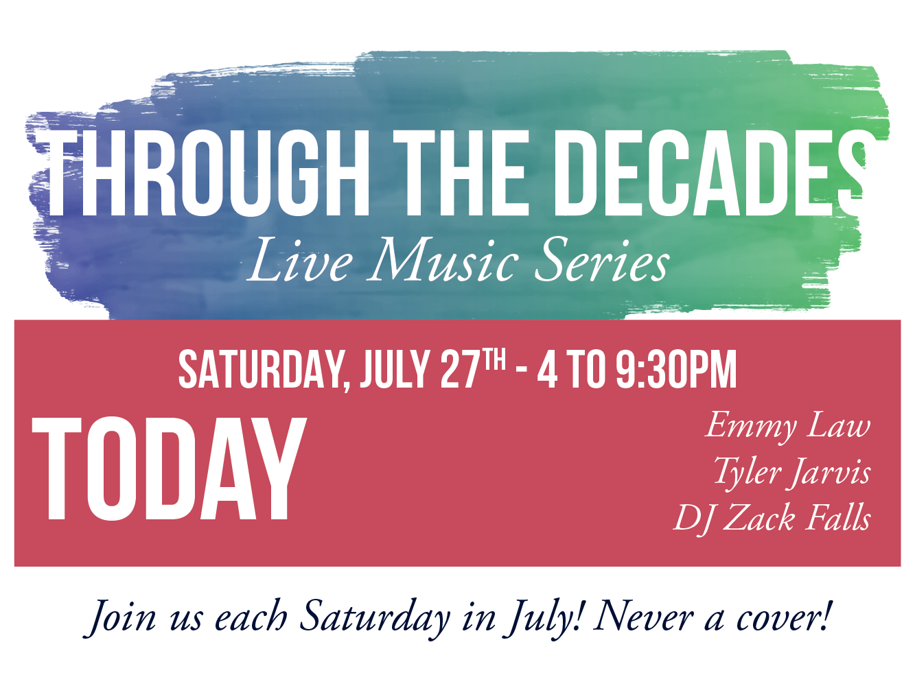 Join us each Saturday in the month of July to hear great live music from the 1970s, 1980s, 1990s and the hits of today!